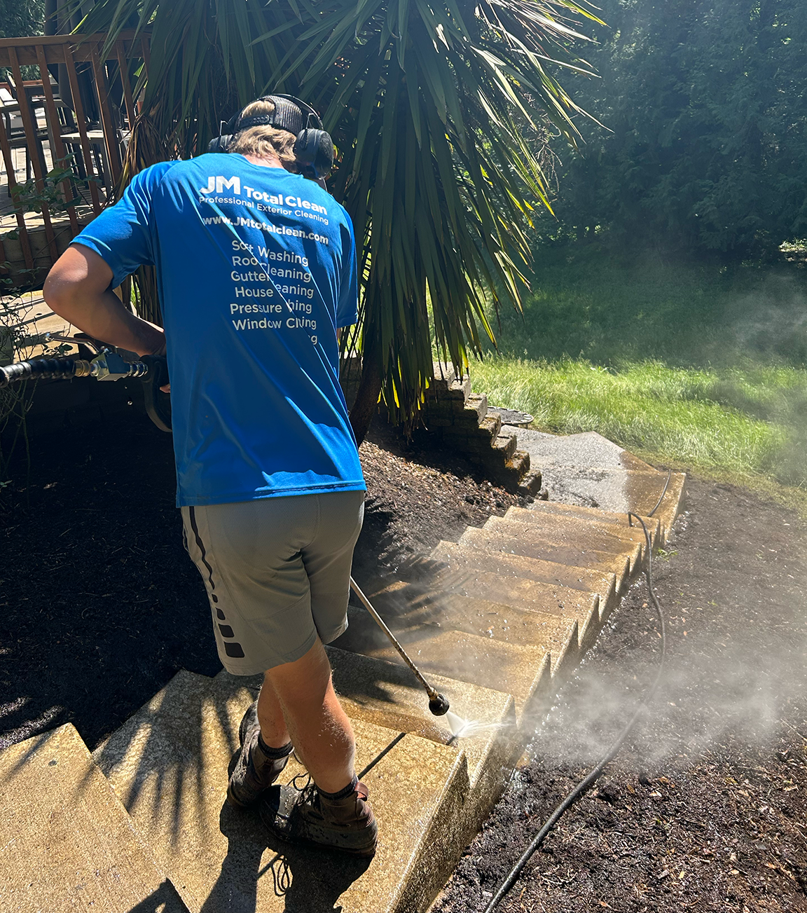Every surface is different, which is why we choose a cleaning solution specifically suited to the material—whether it's concrete, wood, vinyl, brick, or composite. We use eco-friendly, biodegradable detergents that effectively break down dirt, algae, mildew, and stains without harming your landscaping or hardscapes.